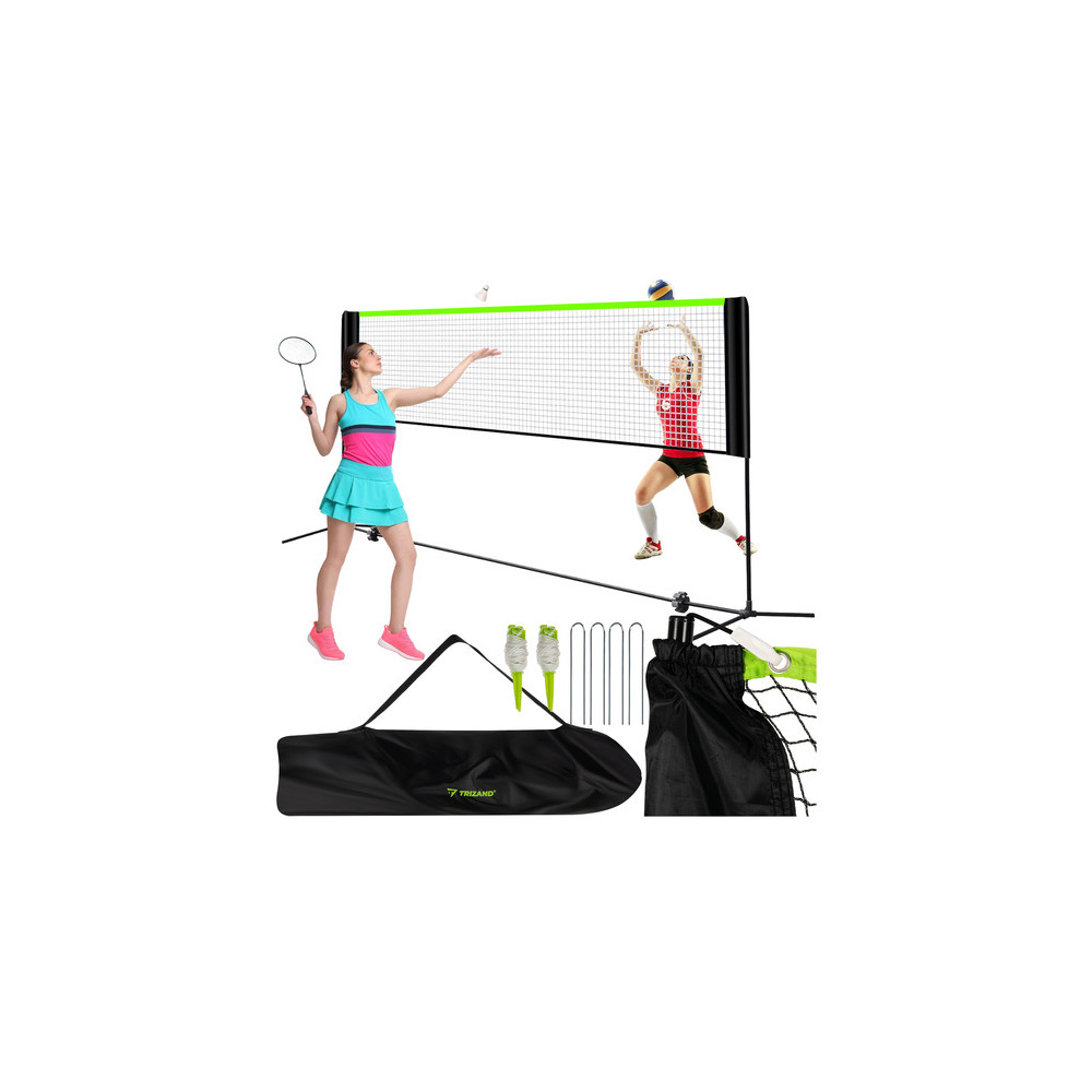 volleyball, tennis, and badminton nets easy assembly without tools for children and adults possibility to play at different levels of advancementpossibility to play at different levels of advancement stored in a case/bag laptop/mobile improves technique and playing precision marks the center of the court bag included complete set ready to play powder-coated steel frame stabilization system Pipe diameter: 22 / 19 mm mask size: 310 x 90 cm smooth height adjustment: 93 - 255 cm mask size: x cm Overall dimensions: 310 x 225 x 155 cmCombined dimensions: 310 x 225 x 155 cm weight: 4.5 kg Net weight with packaging: 5 kg brand: TRIZAND mesh color: black material: PE, oxford fabric, galvanized steel, PP, EVA, PVC, PC Context: