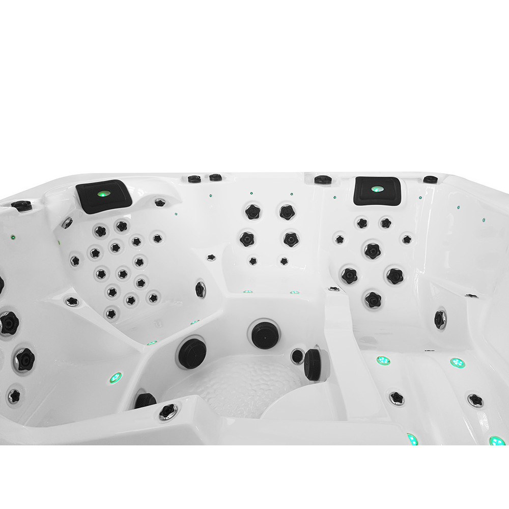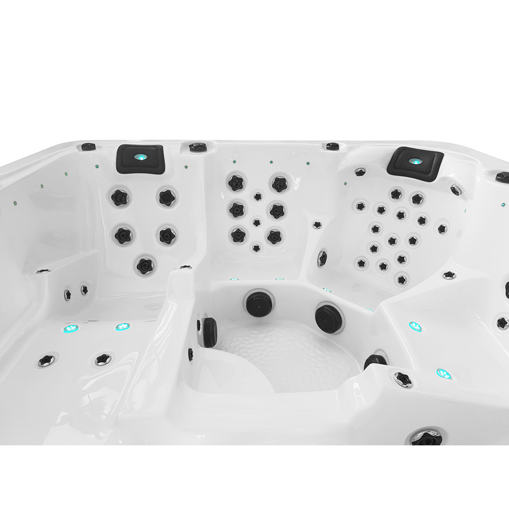 The structure is made of stainless steel. The entire bathtub rests on a stable stainless steel frame, thanks to which the bathtub has a strong and durable supporting base, which is very important for larger bathtubs. The weight of such SPAs ranges from 250 kg to even 1500 kg in pools, and additionally including the weight of water and people, it is a relatively large weight that requires solid support, which is why a good construction of the bathtub is so important.
