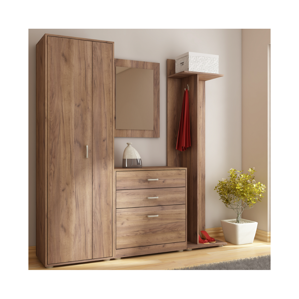 The wardrobe has one wardrobe with a hanger holder and a shelf, a three-door wardrobe (for shoes) with two drawers, a mirror and two shelves.