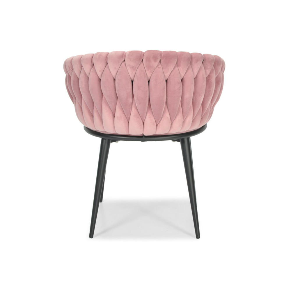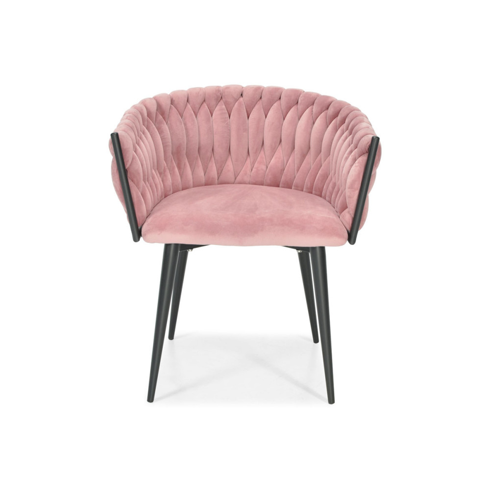 Welurowe krzesło do jadalni, salonu, gabinetu, sypialni lub toaletki. Różowe krzesło z podłokietnikami obite welurem na czarnych nogach. Krzesło fotelowe z plecionym oparciem do stylu glamour i Art Deco i nowoczesnym. Różowo-czarne krzesło tapicerowane