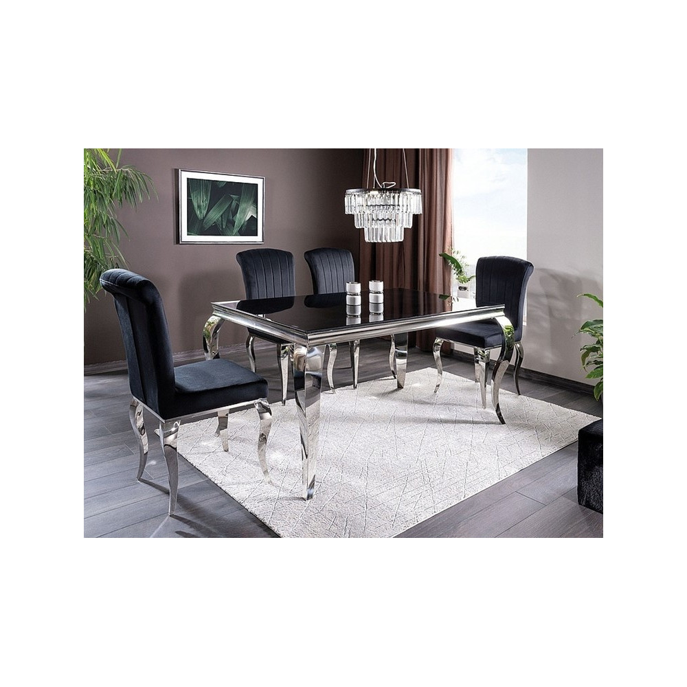 The Price chair, full of elegant character, will give any living room and dining room an exquisite look. The massive chair upholstered with black velvet has aesthetic vertical stitching, high, the slightly profiled backrest resembles old royal chairs, but made in a modern style. Also noteworthy is the chrome-plated, shiny frame with an eye-catching shape.