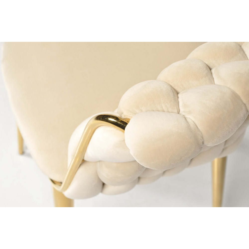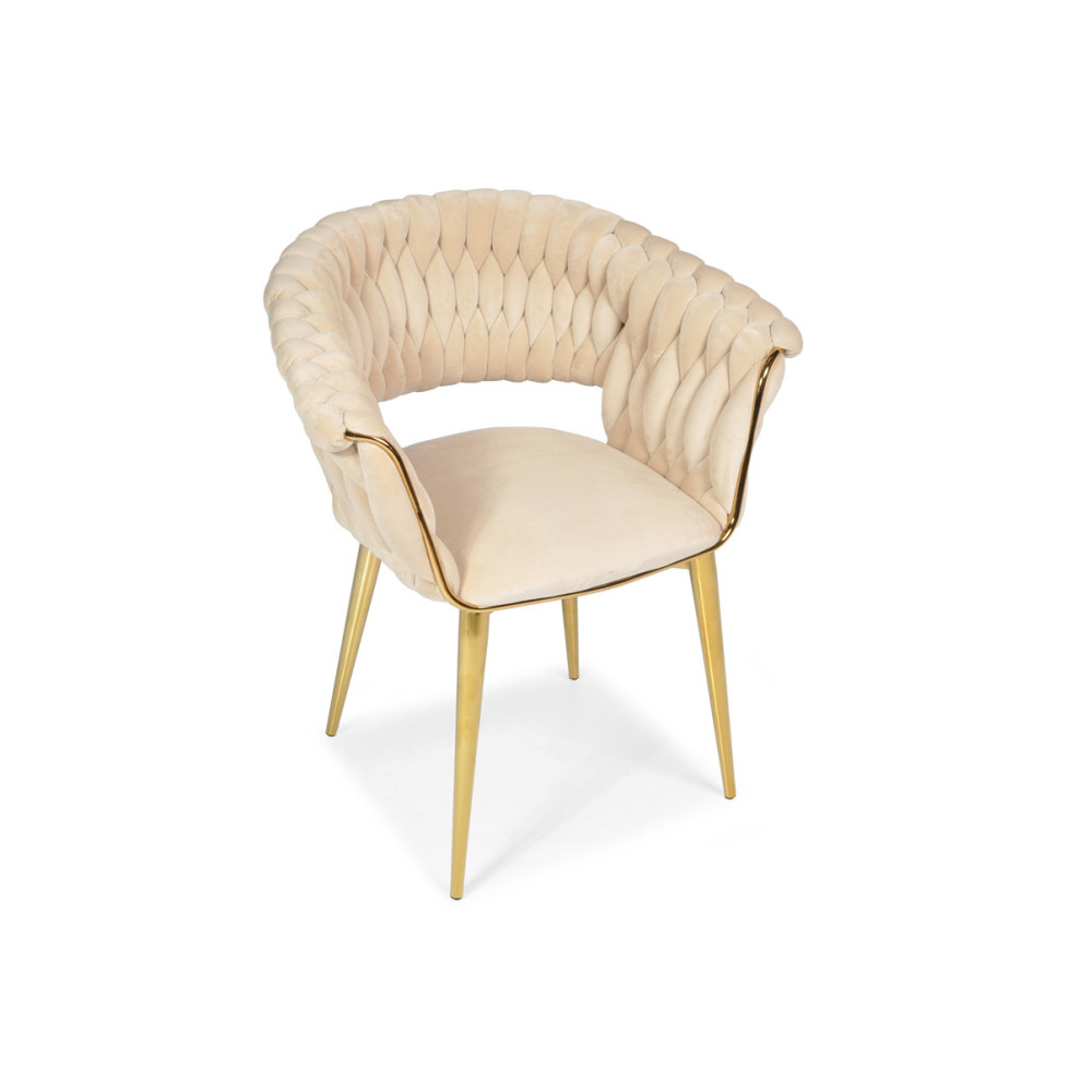 Glamor chair with interwoven backrest, upholstered with elegant velvet fabric. Stable frame made of gold-chromed steel. The beautiful powder pink color and luxurious design make the chair a decoration for a dressing table or desk.