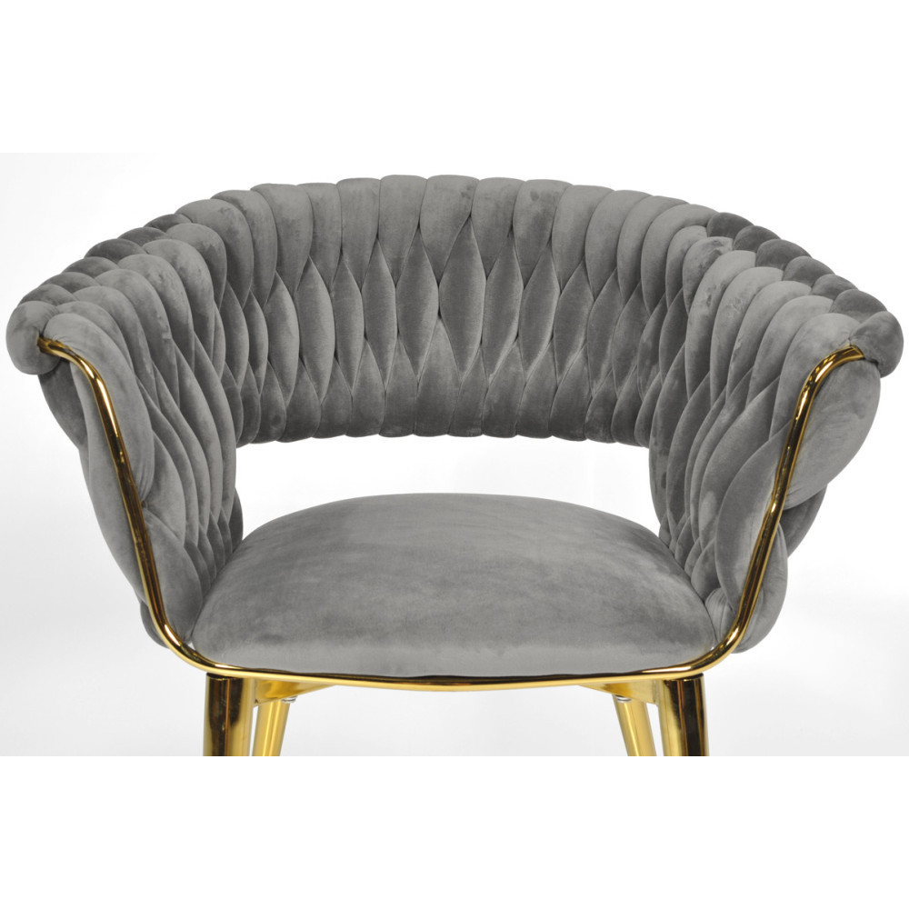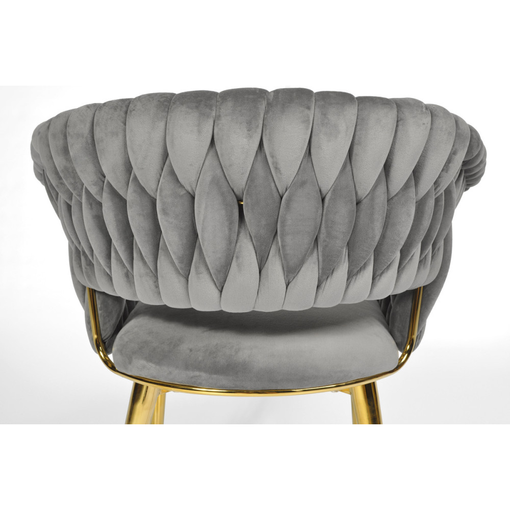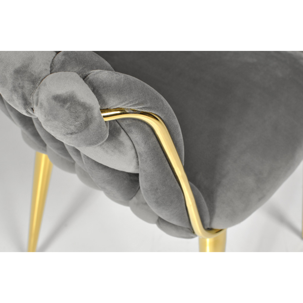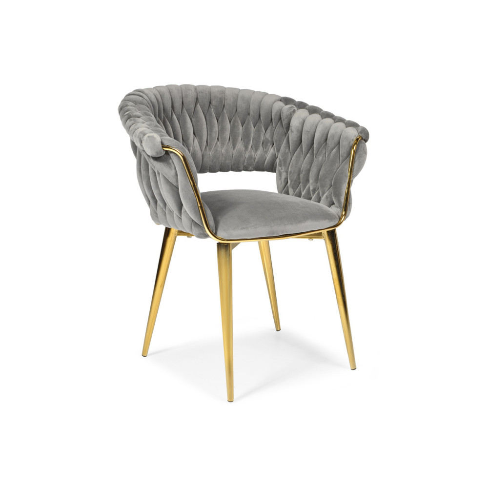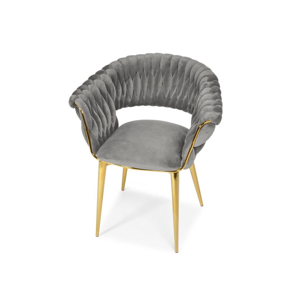 Ekskluzywne krzesło IRIS LUX zachwyca eleganckim wyglądem i luksusowym wykończeniem. Ażurowe, plecione oparcie w szarym welurze typu Velvet w połączeniu ze złotymi nogami tworzy niepowtarzalny efekt wizualny, który przyciąga wzrok i podkreśla charakter wnętrza. Idealne do salonu, jadalni, gabinetu lub sypialni.