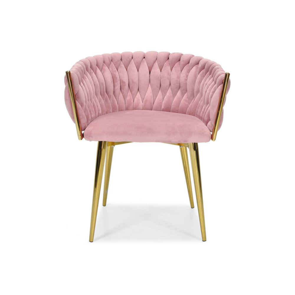 A velvet chair for the dining room, living room, office, bedroom or dressing table. A pink chair with armrests upholstered in velvet on black legs. Armchair with woven backrest for glamorous, Art Deco and modern styles. Pink and black upholstered chair