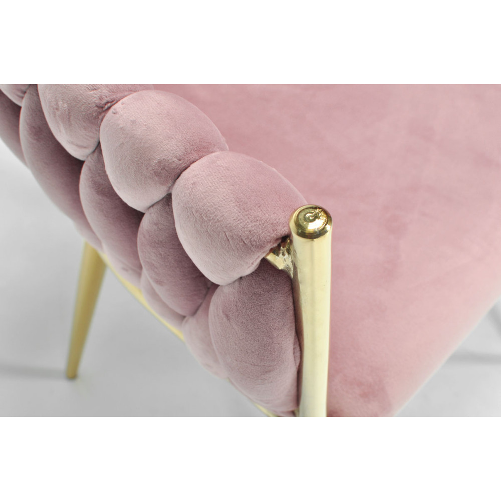 Welurowe krzesło do jadalni, salonu, gabinetu, sypialni lub toaletki. Różowe krzesło z podłokietnikami obite welurem na czarnych nogach. Krzesło fotelowe z plecionym oparciem do stylu glamour i Art Deco i nowoczesnym. Różowo-czarne krzesło tapicerowane