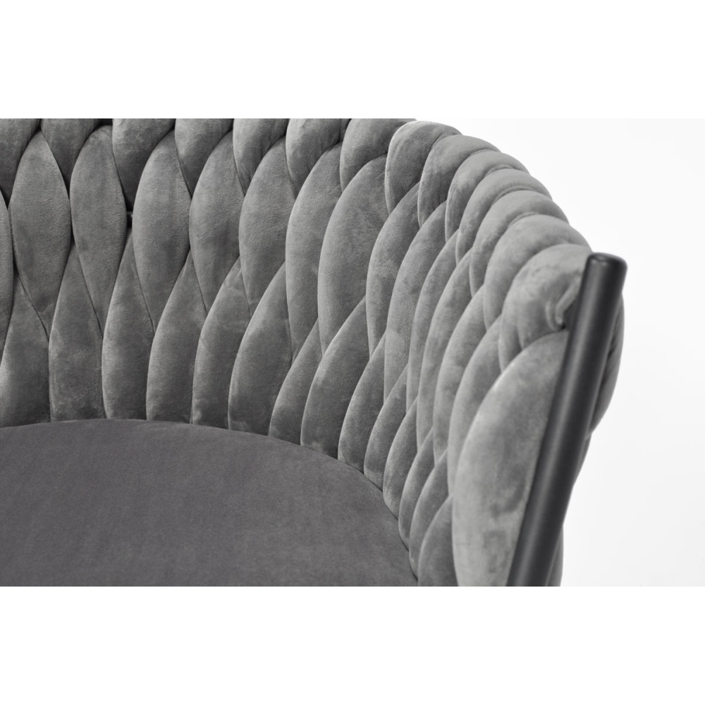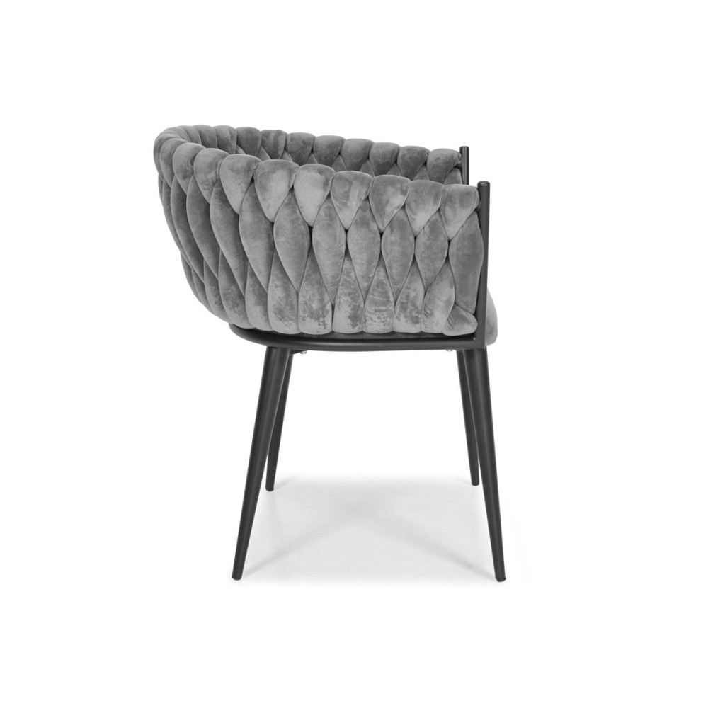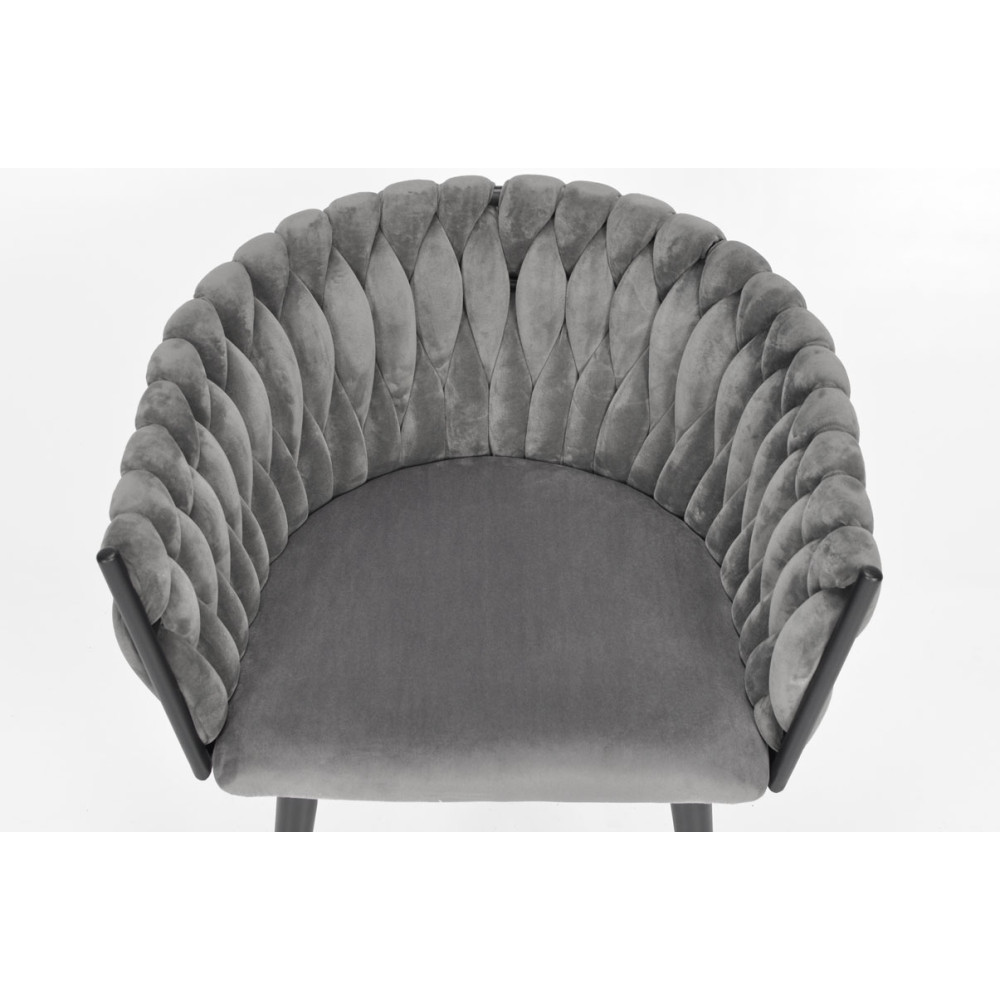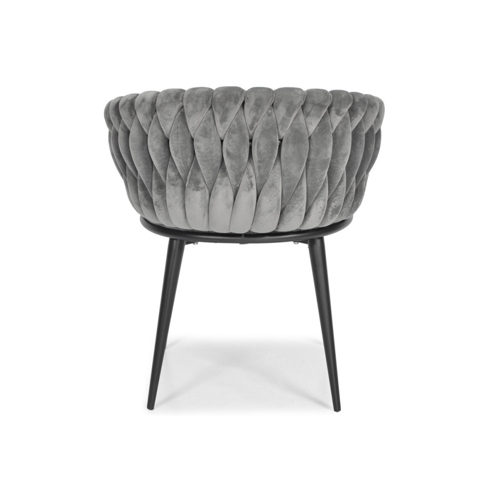 Welurowe krzesło do jadalni, salonu, gabinetu, sypialni lub toaletki. Różowe krzesło z podłokietnikami obite welurem na czarnych nogach. Krzesło fotelowe z plecionym oparciem do stylu glamour i Art Deco i nowoczesnym. Różowo-czarne krzesło tapicerowane
