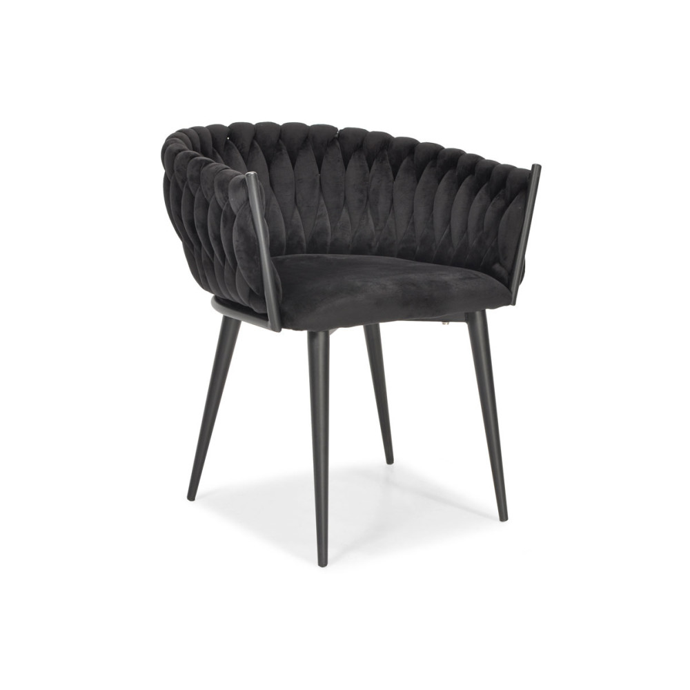 A velvet chair for the dining room, living room, office, bedroom or dressing table. A pink chair with armrests upholstered in velvet on black legs. Armchair with woven backrest for glamorous, Art Deco and modern styles. Pink and black upholstered chair