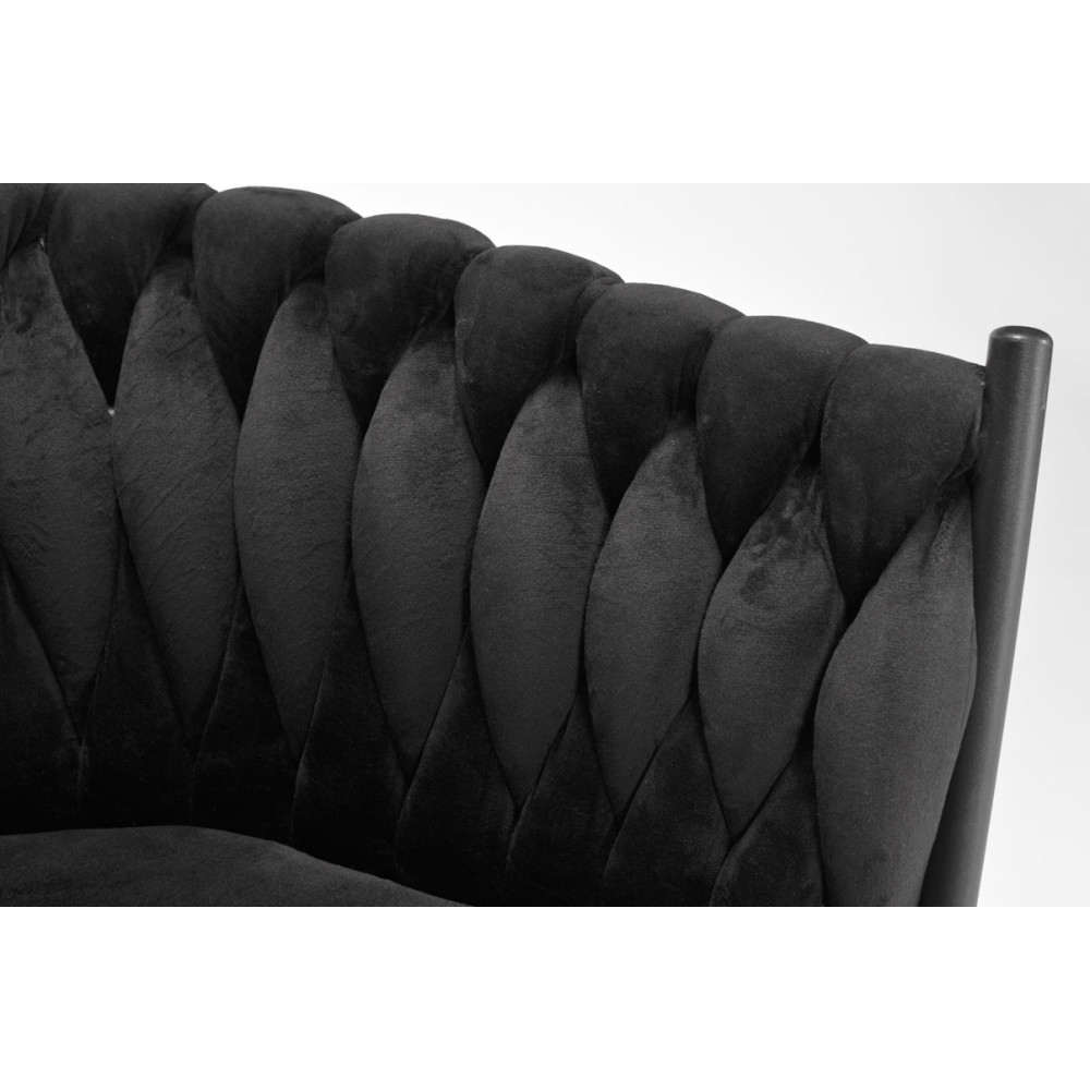 Welurowe krzesło do jadalni, salonu, gabinetu, sypialni lub toaletki. Różowe krzesło z podłokietnikami obite welurem na czarnych nogach. Krzesło fotelowe z plecionym oparciem do stylu glamour i Art Deco i nowoczesnym. Różowo-czarne krzesło tapicerowane