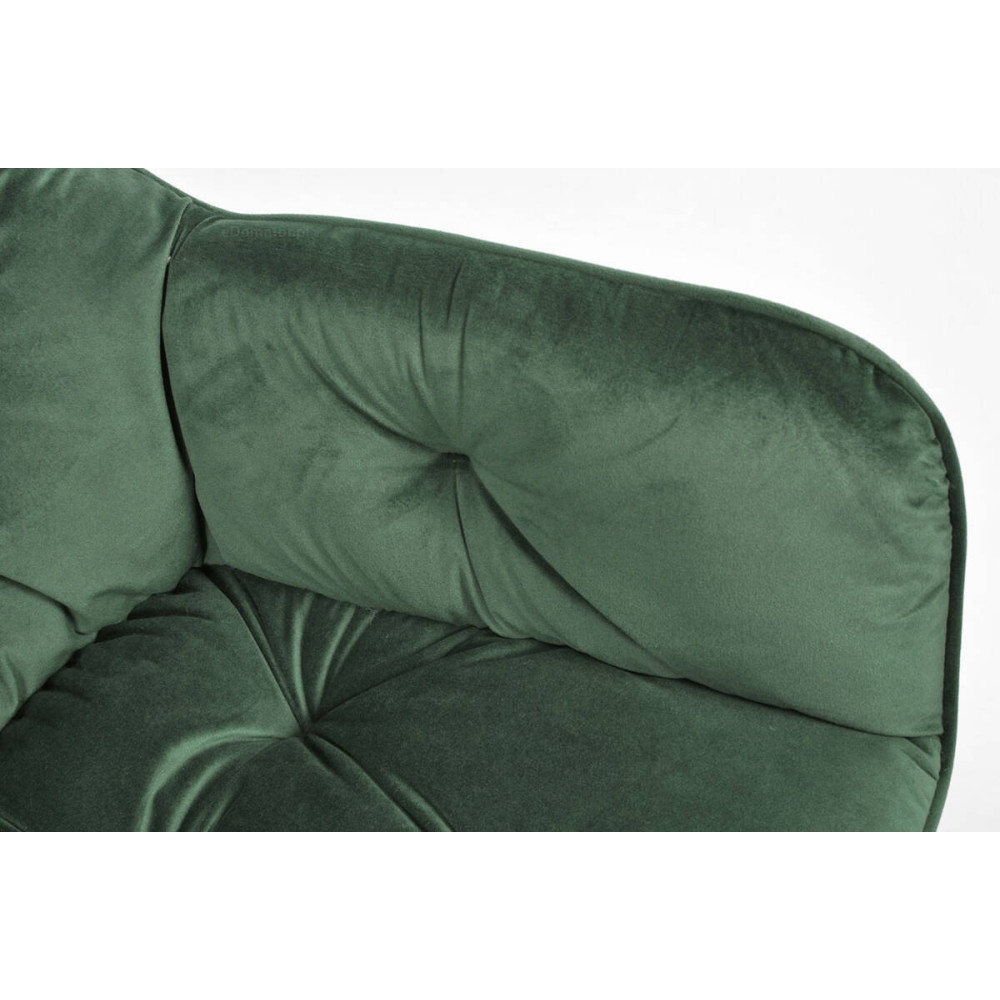 Functional quilted chair for the dining room and living room. A glamorous velvet chair in bottle green color. An armchair with a quilted body and high armrests. The chair is based on black metal legs that provide stability.