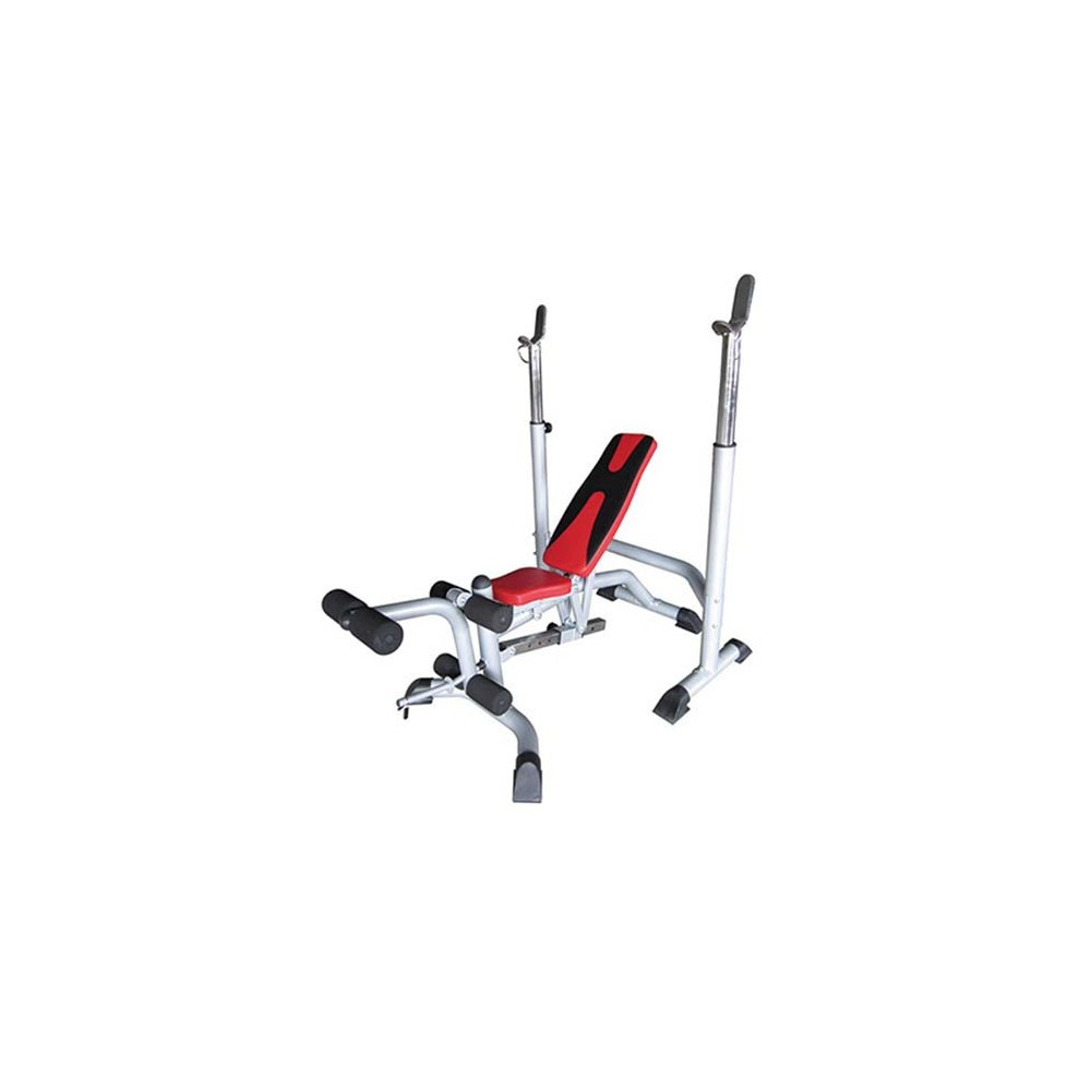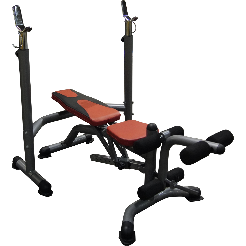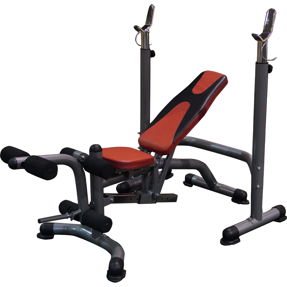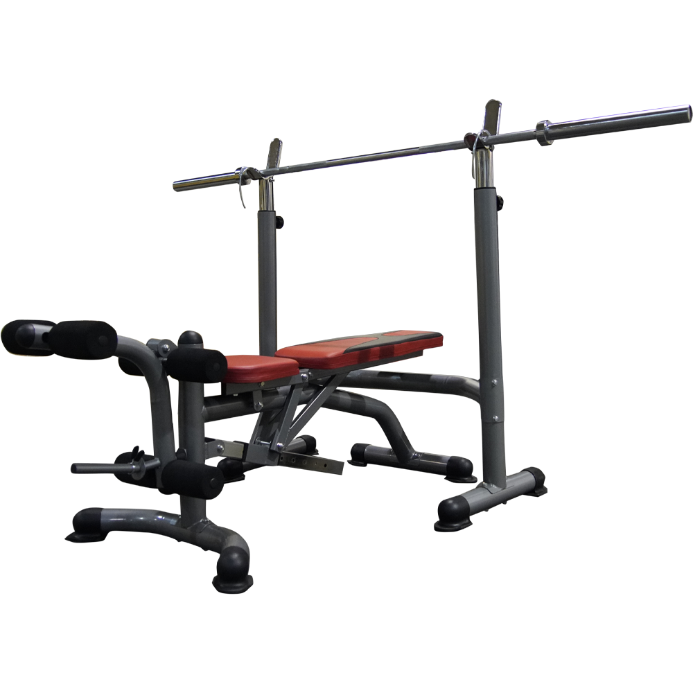 A multifunctional bench that is a combination of a bench with fixed barbell holders and a leg press.