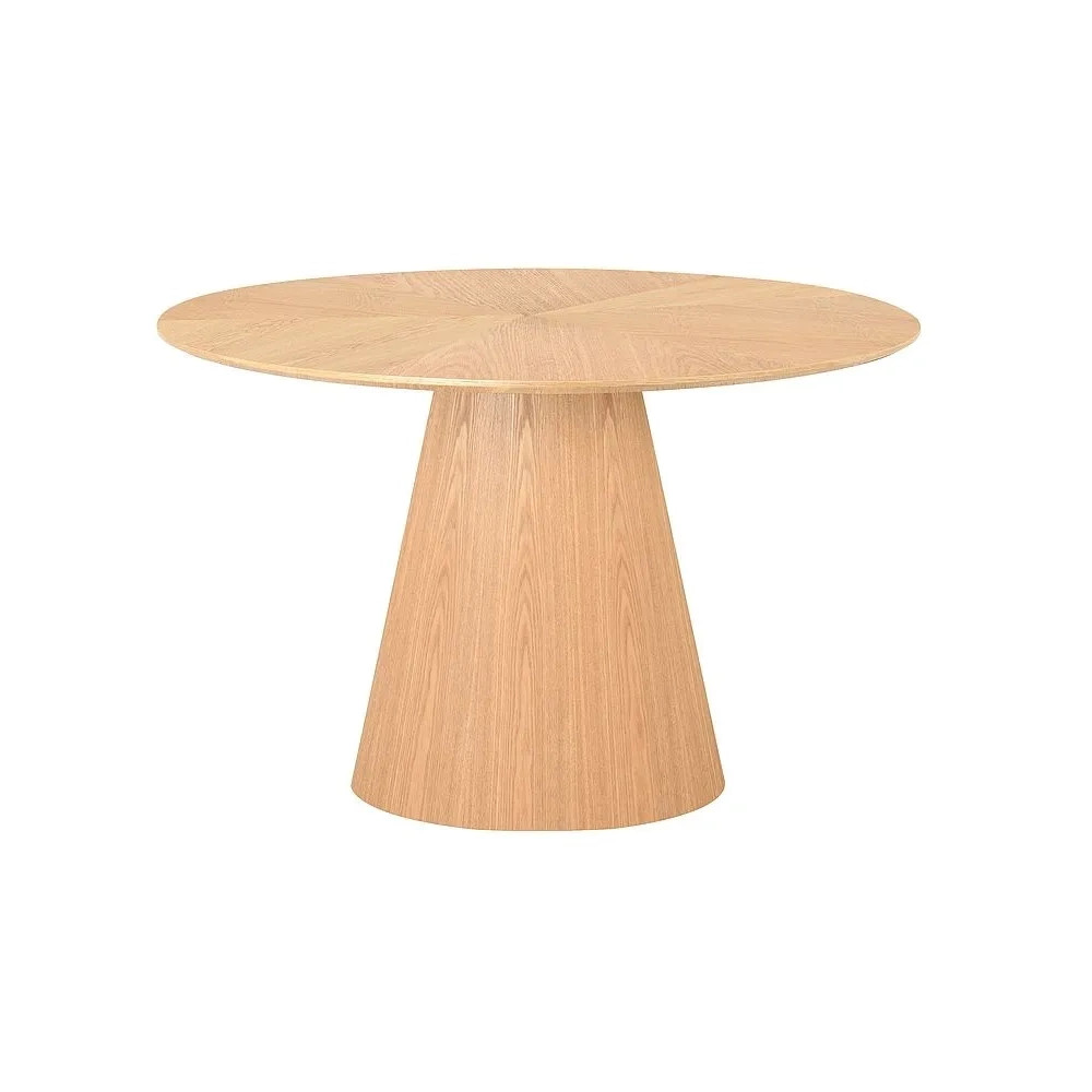 Round tableANGEL is a piece of furniture with a unique design that will be an attractive decoration in the interior. The dining table has a uniform leg that tapers towards the top. Such a table on one leg is, above all, stable, but also durable. A round table is an ideal choice for interiors with limited space, where there is no place to set a classic, rectangular table. The advantage of a table with a round top is the ability to seat more people. Additionally, such a table will keep the interior light without overwhelming it. The ANGEL round table is made of MDF board with natural oak veneer. The table made in this way has a surface resembling natural wood, which increases its attractiveness. The oak colors of the dining table make that it will fit almost any interior and decor, regardless of the current fashion.