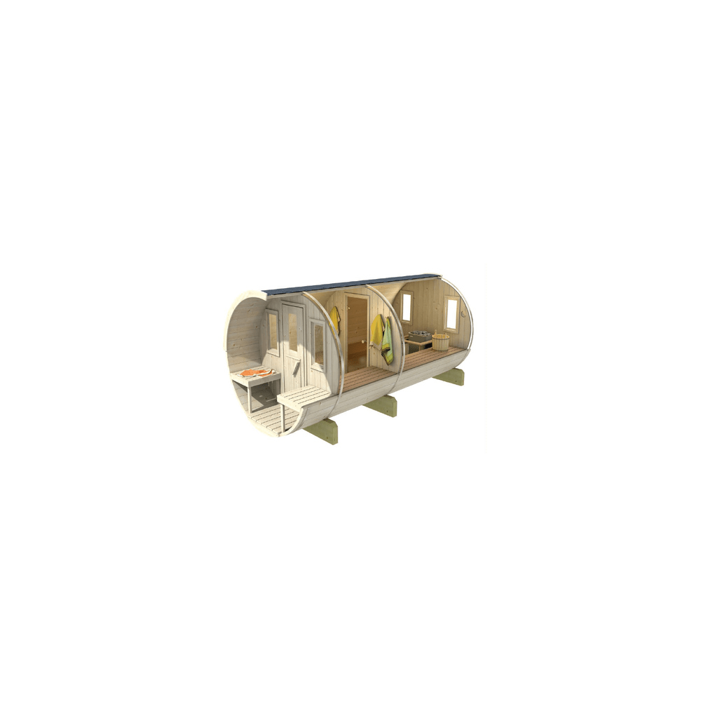 2-chamber barrel sauna with canopy for year-round use. The spacious heating room can accommodate up to 7 people, and there is a second chamber (127 cm long) + an external balcony with seats for getting dressed or cooling down. This way, all groups can be protected from rain, snow, sun or anything else. It fits well in our climate for year-round use for medium-sized groups.
