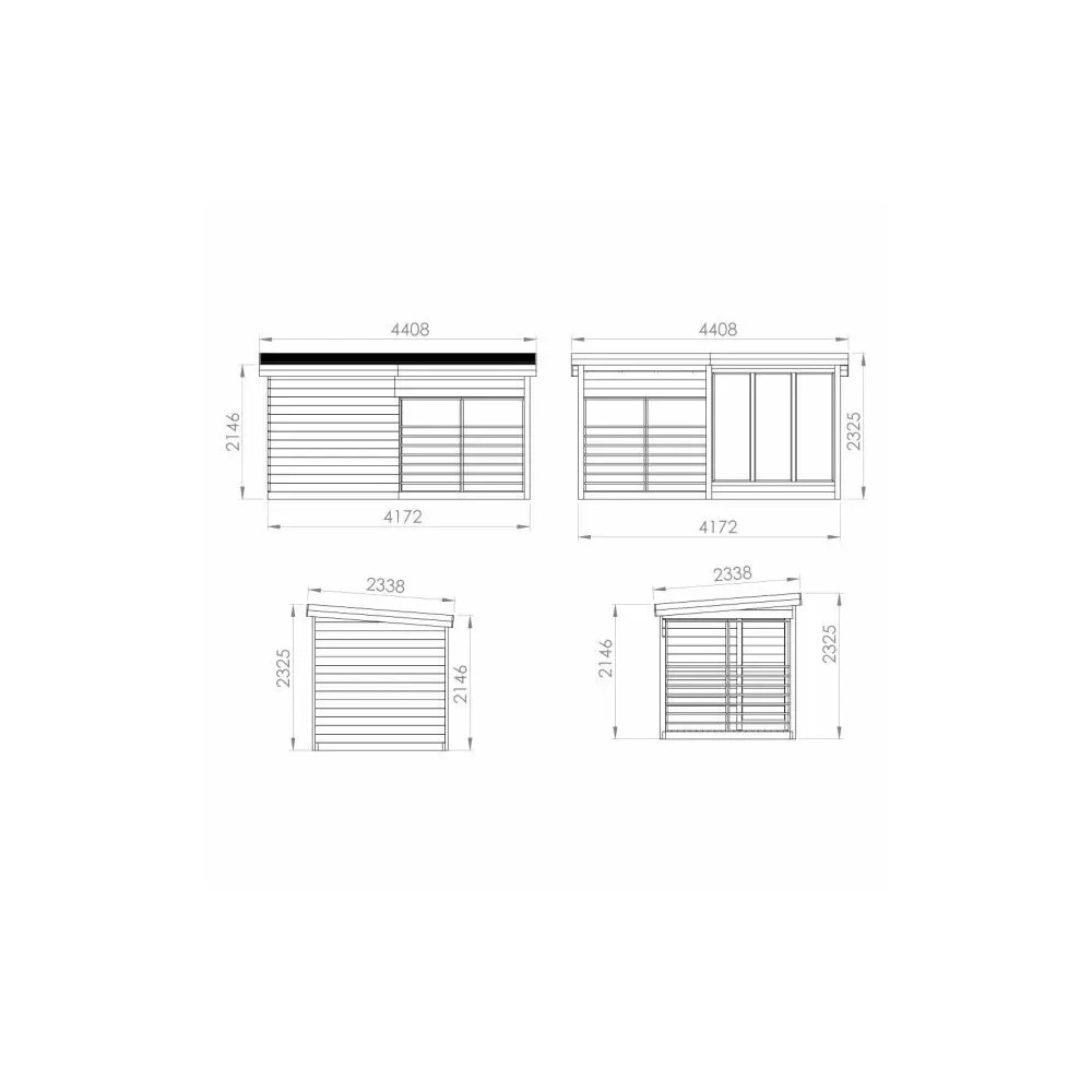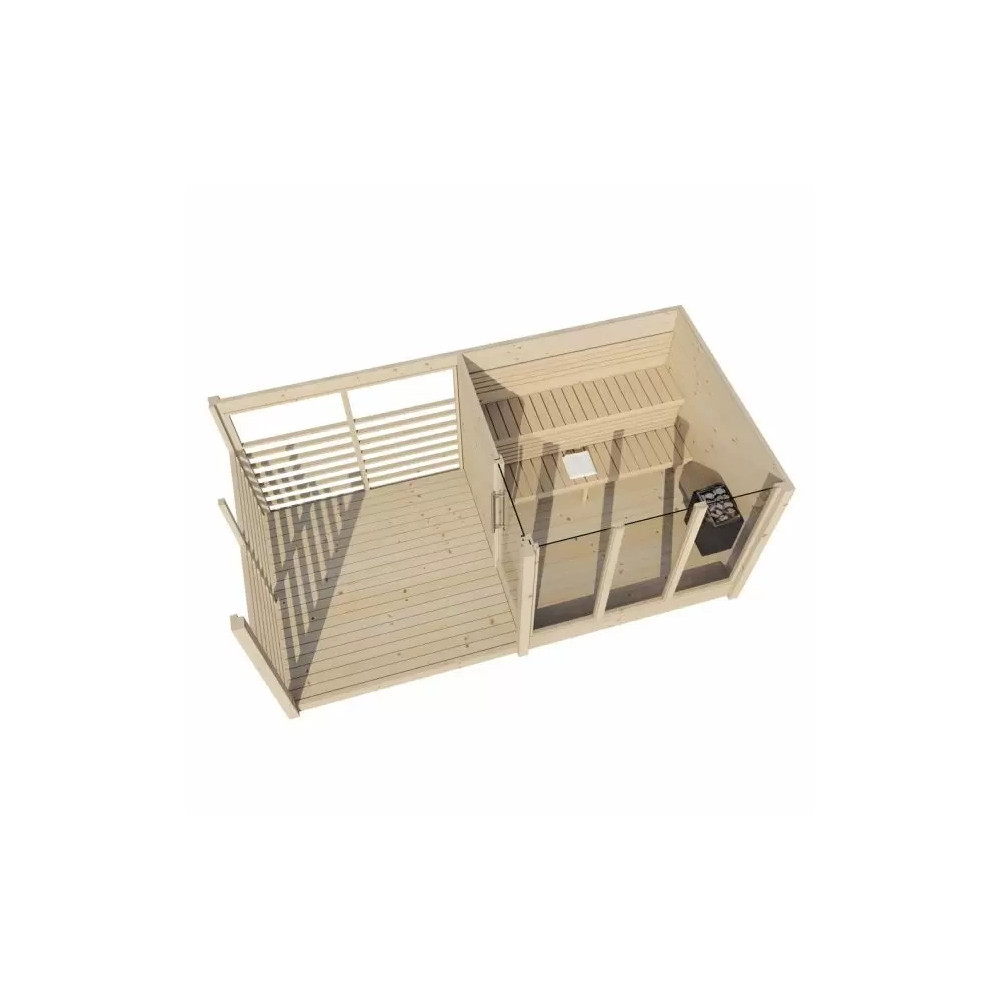 Anita Sauna: Modern glazed sauna with terrace made of solid 42 mm Nordic spruce with 2-level aspen benches with attached backrests. This is a simple yet elegant model for any garden. It has a large 4 mm tempered glass front that provides plenty of light. 8 mm tempered glass doors. Self-adhesive roof covering included. 4 m2 inside. This sauna is made of spruce, selected for its properties that give it a better structure than pine. Perfect when you want to escape stress and just relax without even leaving the garden.