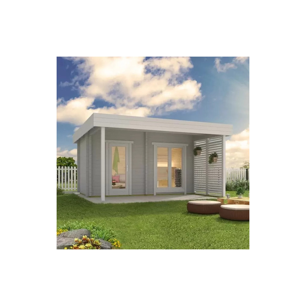 Modern 2-room cube sauna made of solid 70mm Nordic spruce with 2-level aspen benches with attached backrests. This is a simple yet elegant model for any garden. It has a large 4mm double tempered glass window providing plenty of light in the sauna. Can be ordered with insulated roof panels in the sauna. Self-adhesive roof covering included. 4m2 inside sauna and 4m2 changing room/relaxation room. This sauna is made of spruce, selected for its properties that give it a better structure than pine. Perfect when you want to escape stress and just relax without even leaving your garden.