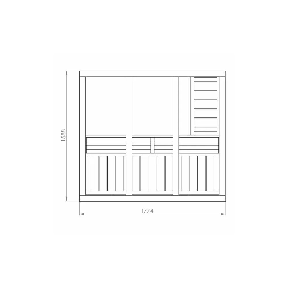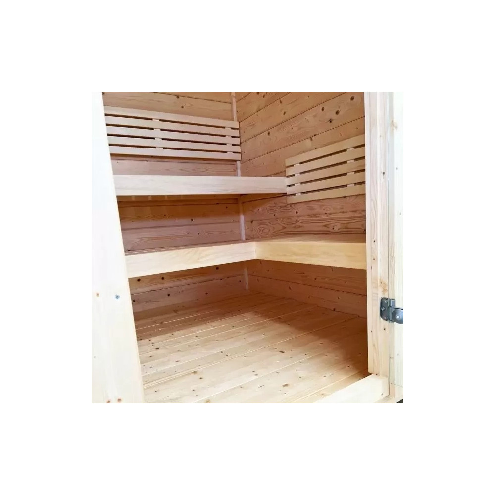 The Brico Sauna is a compact yet elegant outdoor sauna designed with comfort and durability in mind. With a surface area of 1.8m x 1.6m, this sauna fits well into smaller spaces while still offering an immersive sauna experience. The structure has 42mm thick walls for excellent insulation and stability, and the height is 2.33m, providing ample headroom. The sauna includes foundation beams and a solid floor for improved stability and durability. Inside, the backrests are made of knot-free aspen wood for a smooth, comfortable feel. Tempered glass doors add a modern aesthetic and provide security, while the self-adhesive roof felt makes installation simple and safe. For those looking to customise their sauna experience, optional extras include an EPDM roof membrane, an electric Harvia heater or a traditional wood-burning heater, allowing for personalised heating options.