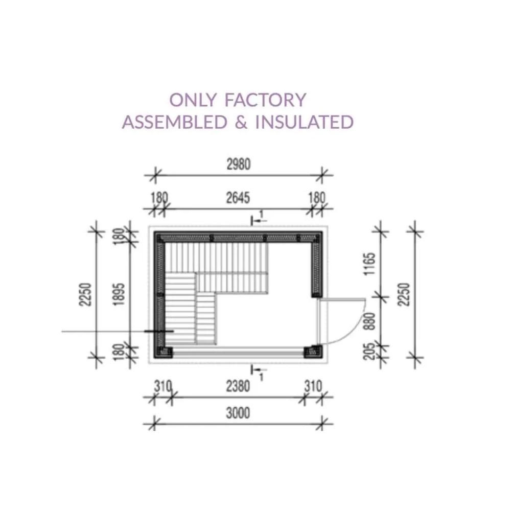 The sauna cabin has thick walls of 18 cm that combine wood and mineral wool insulation.