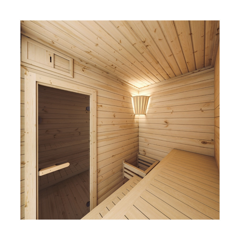 The sauna's interior is functionally divided into a vestibule and a main sauna area, comfortably accommodating up to 5 people. Equipped with two comfortable linden wood benches and lighting in the form of two waterproof porcelain lamps in wooden casings, the sauna ensures not only comfort but also aesthetics at the highest level.
