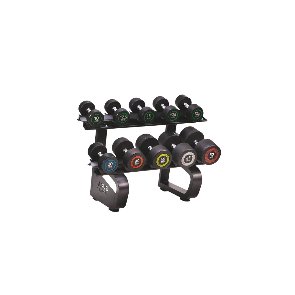 Profesjonalny Stojak na Hantle Palladium marki Apus Sports został wykonany ze stali lakierowanej proszkowo. Stojak posiada konstrukcję dwurzędową – każdy rząd wyposażony jest w specjalne siodełka wyprodukowane z wysokiej jakości tworzywa sztucznego, dzięki czemu hantle podczas ich odkładania na miejsce nie ulegają zniszczeniu i się nie ślizgają.