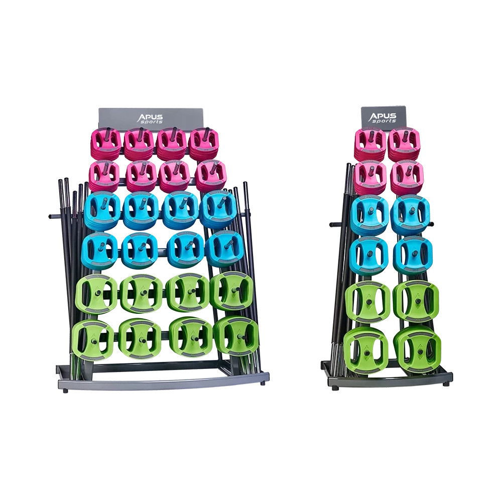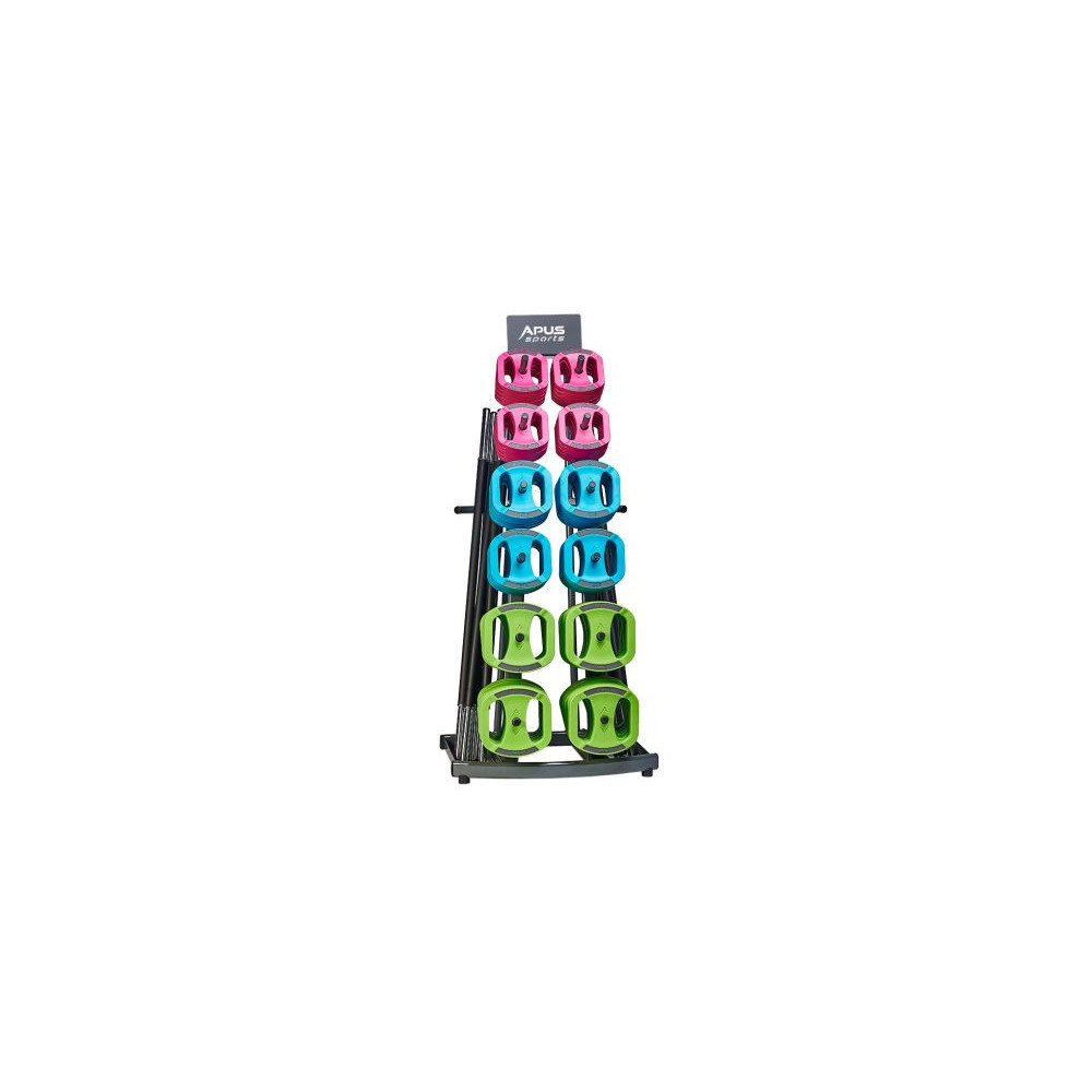 Stojak na zestaw Space Bar od Apus Sports zapewnia idealną organizację i uporządkowanie tych akcesoriów w klubie fitness lub na siłowni. Stojak został zaprojektowany zgodnie z zasadami ergonomii tak, aby odkładanie i podnoszenie obciążeń było wygodne. Dodatkowo wyposażony jest w miejsce do przechowywania gryfów oraz zacisków.