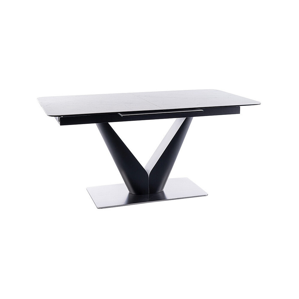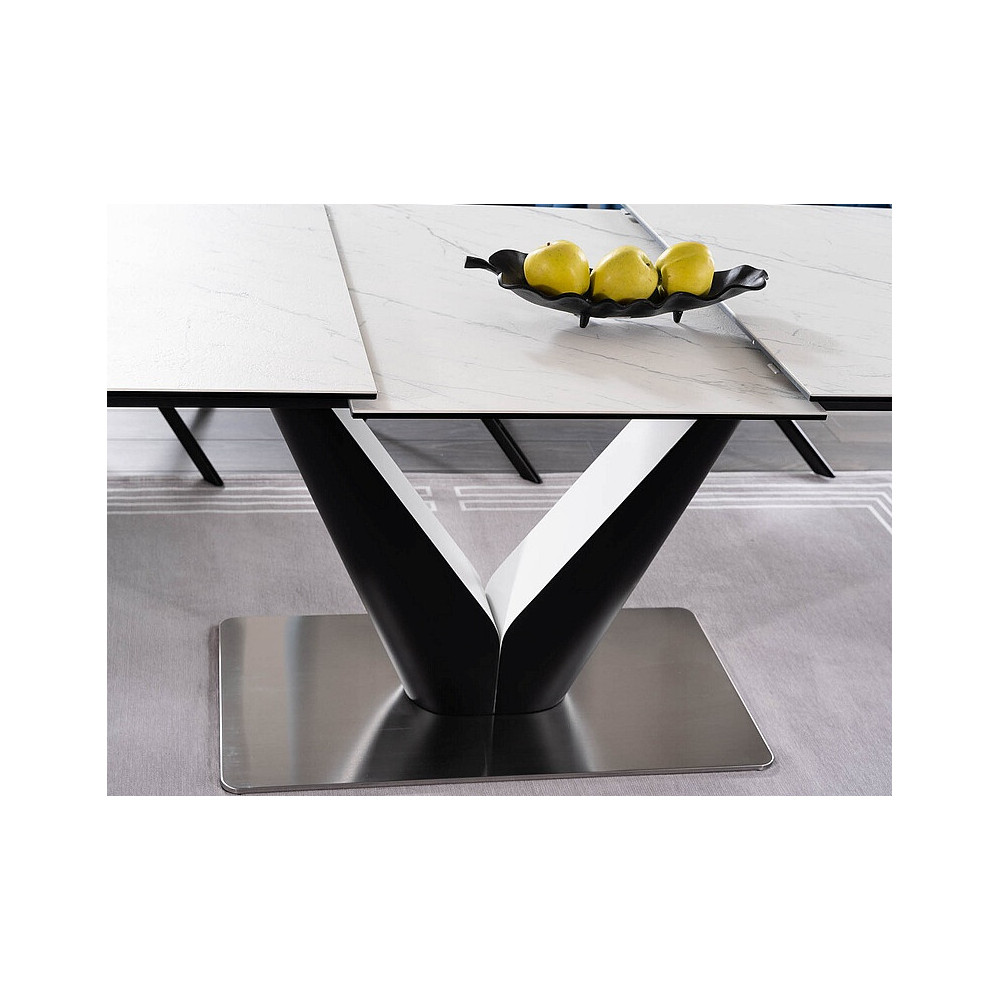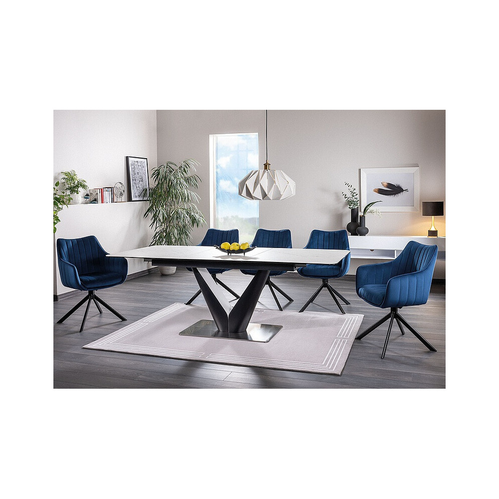 The Canyon Ceramic table 160(2200)x90 with a marble effect is a new table proposal that is quickly gaining fans. This unique design attracts attention and is extremely practical and comfortable in everyday use. The combination of tempered glass and Italian ceramics adds shine and class to the interior. Additional veining characteristic of marble enlivens the countertop and adds its own character. The extended table can easily accommodate 10 people at a time during family meetings and other special occasions. Rounded corners and an original metal base make the furniture a favorite element of the living room or dining room. The whole arrangement will be complemented by chic velvet chairs with shiny upholstery. The Canyon Ceramic extendable table will also work well in many commercial arrangements, e.g. as a conference table.