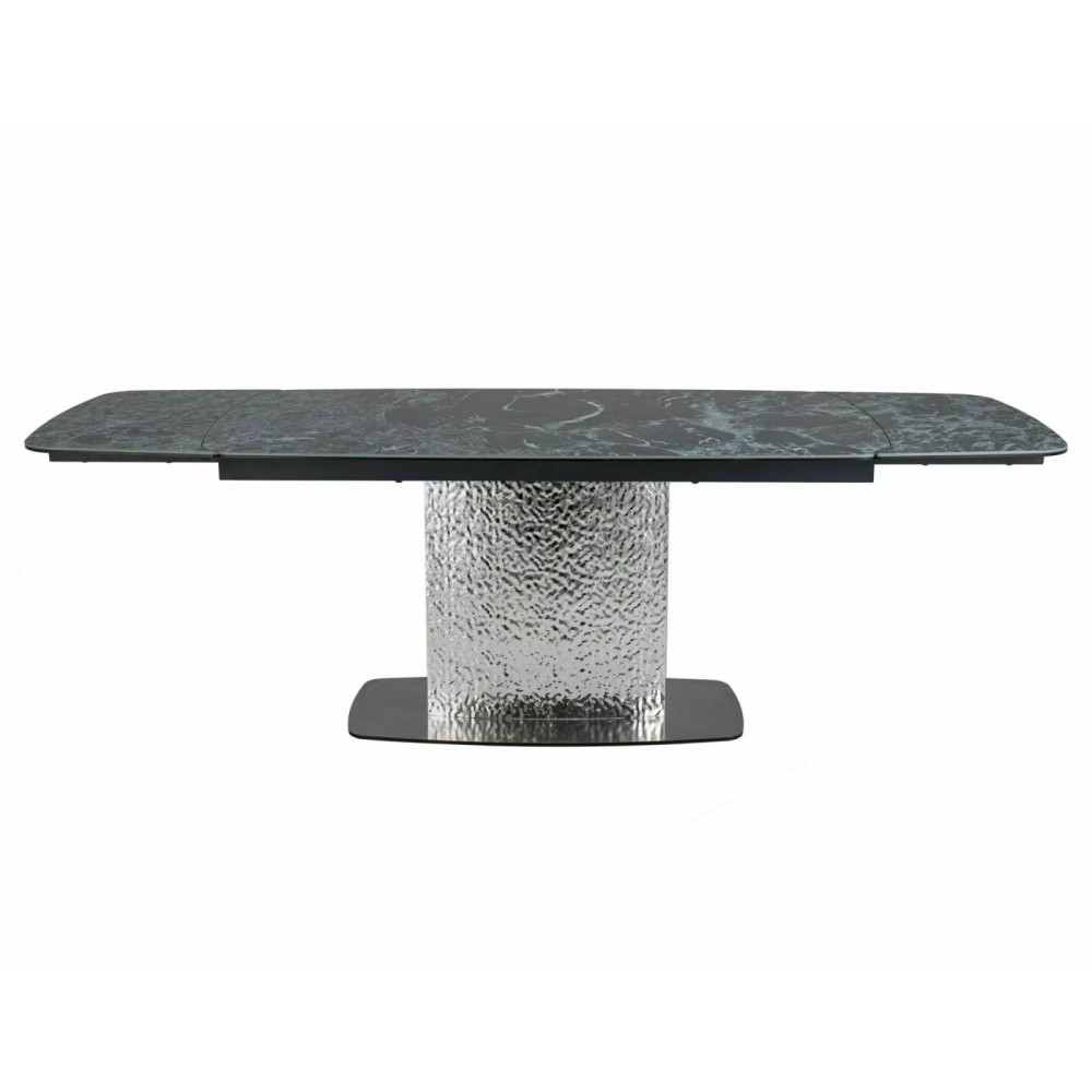 Extendable table, top: tempered glass + VERDE ALPI ceramic, frame: metal, color: sea green / stainless steel.