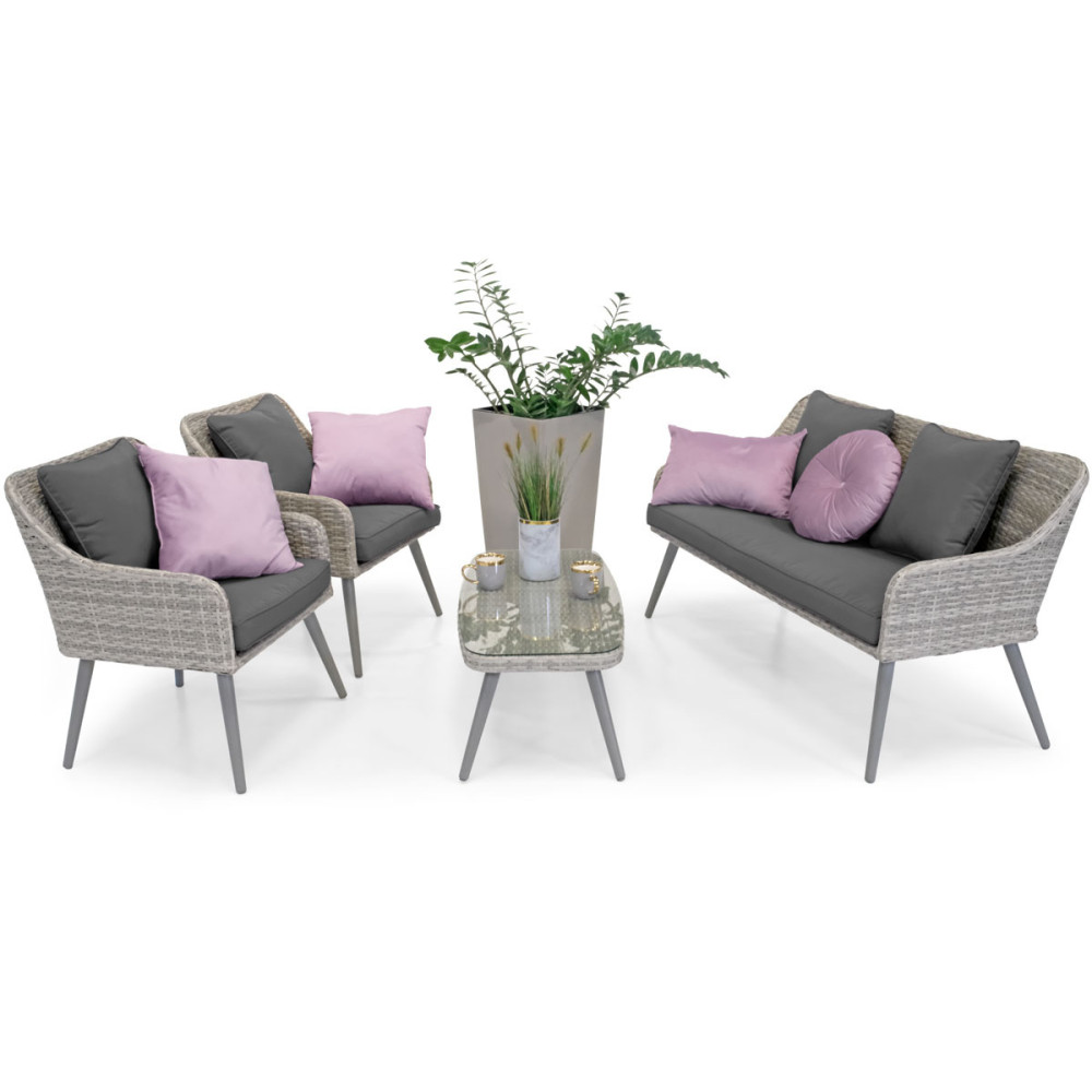 Garden furniture lounge set for four people. A beautiful coffee set made of gray technorattan for the terrace, balcony or garden. The set includes 4 large pillows. The furniture is waterproof and easy to keep clean.