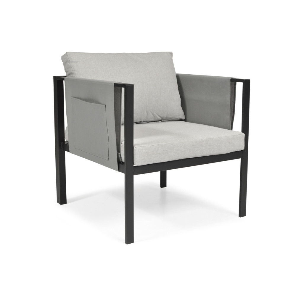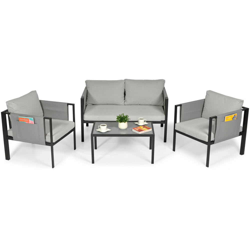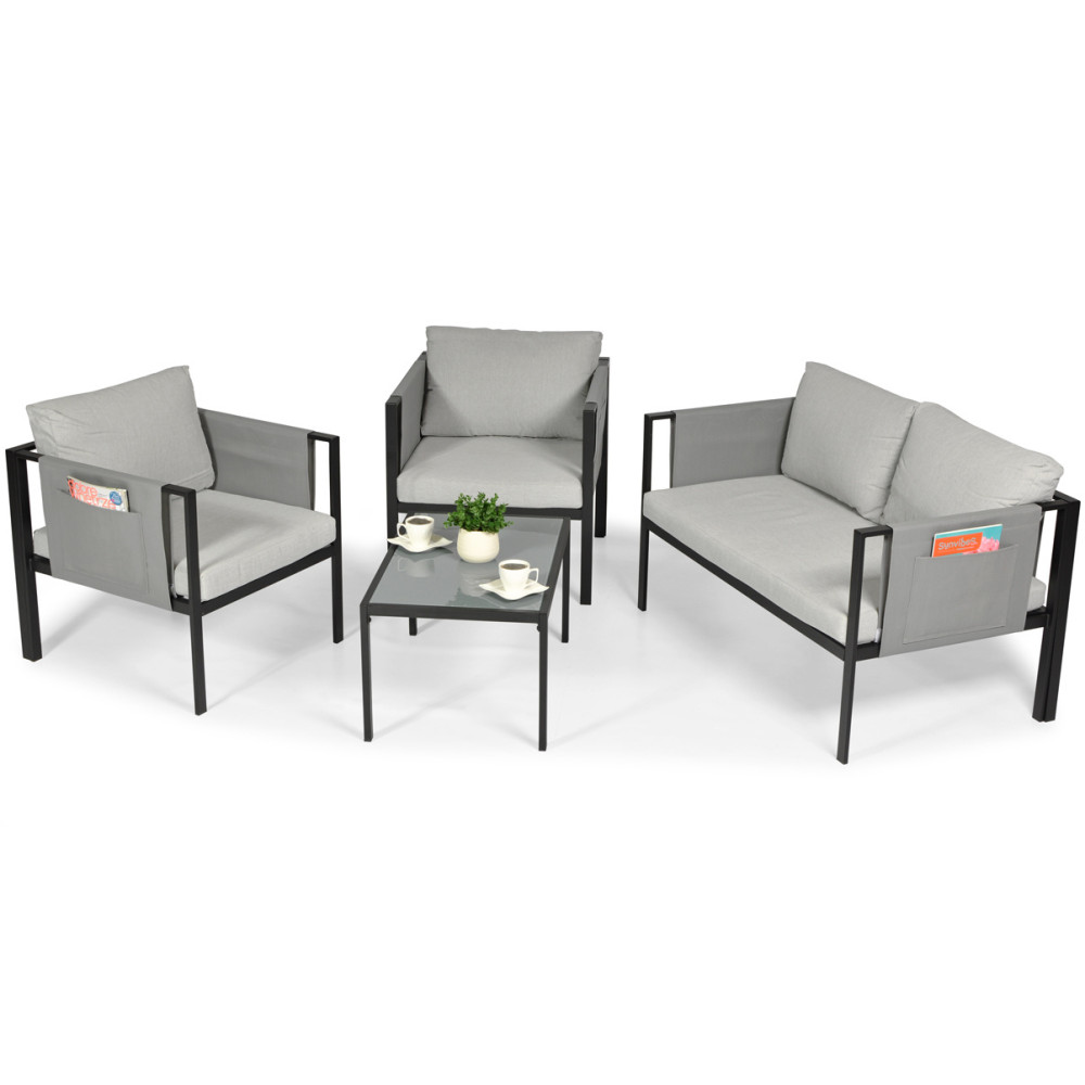 A modern 4-person coffee set, perfect for a terrace, balcony or patio. Gray garden set with a coffee table. Garden lounge set with armchairs for 4 people. A set of outdoor furniture in an industrial and modern style.